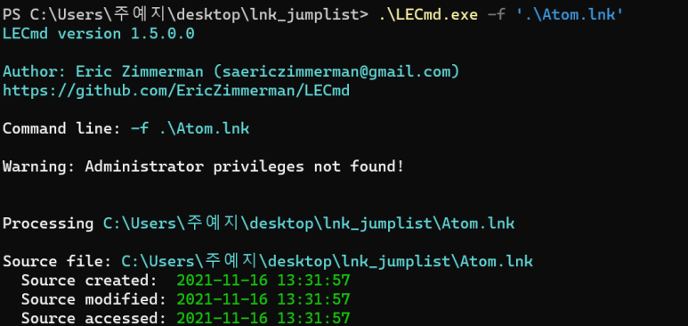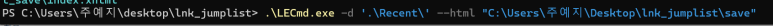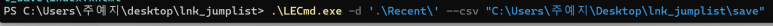 LECmd를 실행 후 -f 옵션을 주고 ' 아까 추출한 바로가기' 를 실행한다.