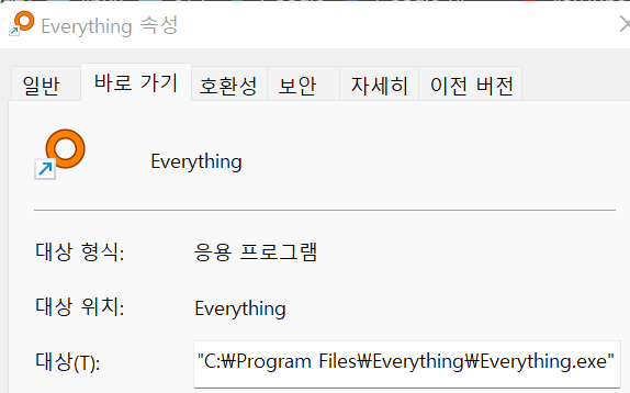 또한 바로가기 탭을 확인해보면