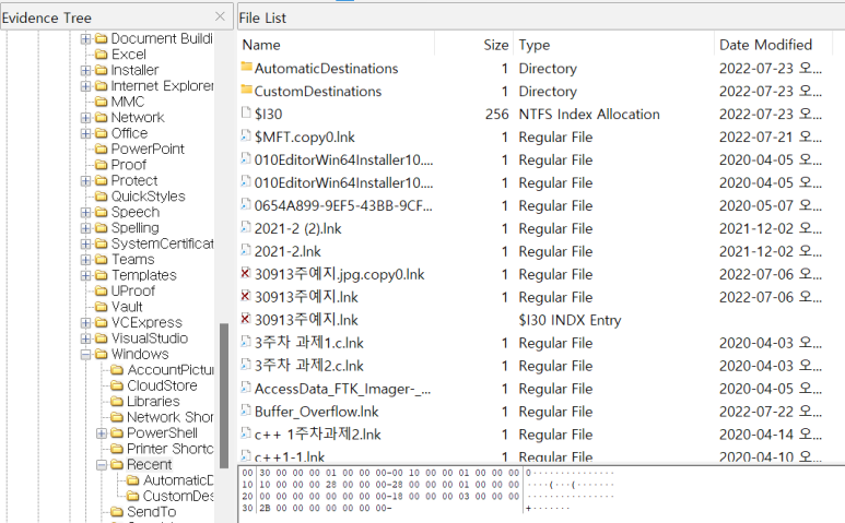 ftk imager에서 다음과 같은 경로로 이동해주면, 수많은 lnk 파일들을 확인할 수 있다.