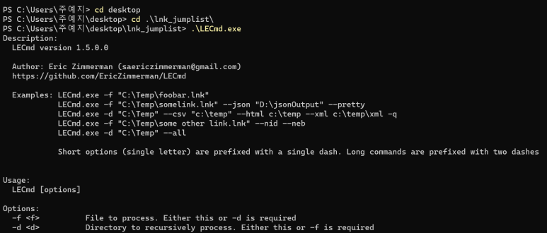 옵션의 사용법을 알아보기 위해서는 터미널에서 LECmd.exe에 -h 옵션을 주면 된다.